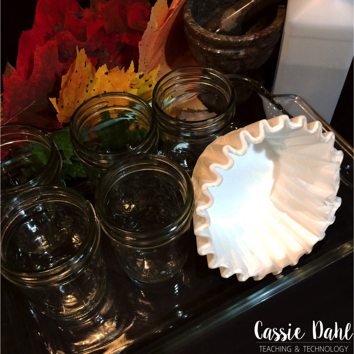 You will also need small mason jars for each of the leaf colors (I used pint sized jars), a bottle of rubbing alcohol, coffee filters and a large glass container.