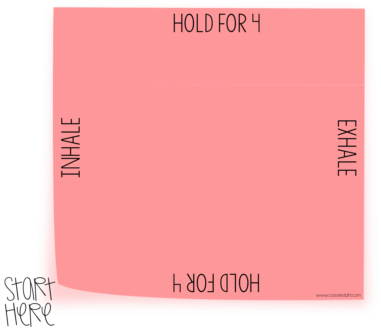 You will need small squares of paper (post-its work well too). Start with the bottom left corner and trace your finger along the side going up. While doing this take in a deep breath. Then move your finger (from top left corner) to the to right corner. This represents holding the breath for four seconds. Bring your finger down (from the top right corner) to the bottom right corner. As you do this, slowly exhale. Finally bring your finger along the bottom edge of the square to your starting corner. This represents holding in between breaths for four seconds. Repeat 3-5 times. {The diagram below illustrates the technique.}